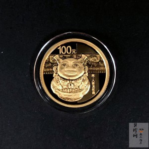 在现代设计中,幽默诙谐的表现手法已经非常广泛,但是这款青铜器在器物众多的青铜世界里却非常罕见,所以这枚金币在整个系列里也是非常独特的,体现出了让人耳目一新的幽默感之美。在金币的画面中,强调了这款青铜器稚拙、憨厚、质朴的造型,弥漫着浓郁的民俗乡土气息。通过凸显器特定的俏皮夸装的外形特征,尤其是那一双细眉鼓目,张扬青铜器少有的真气质朴,没有了我们惯常见到青铜器的庄重、神秘和宏大,而是生机、活泼、质朴天真。