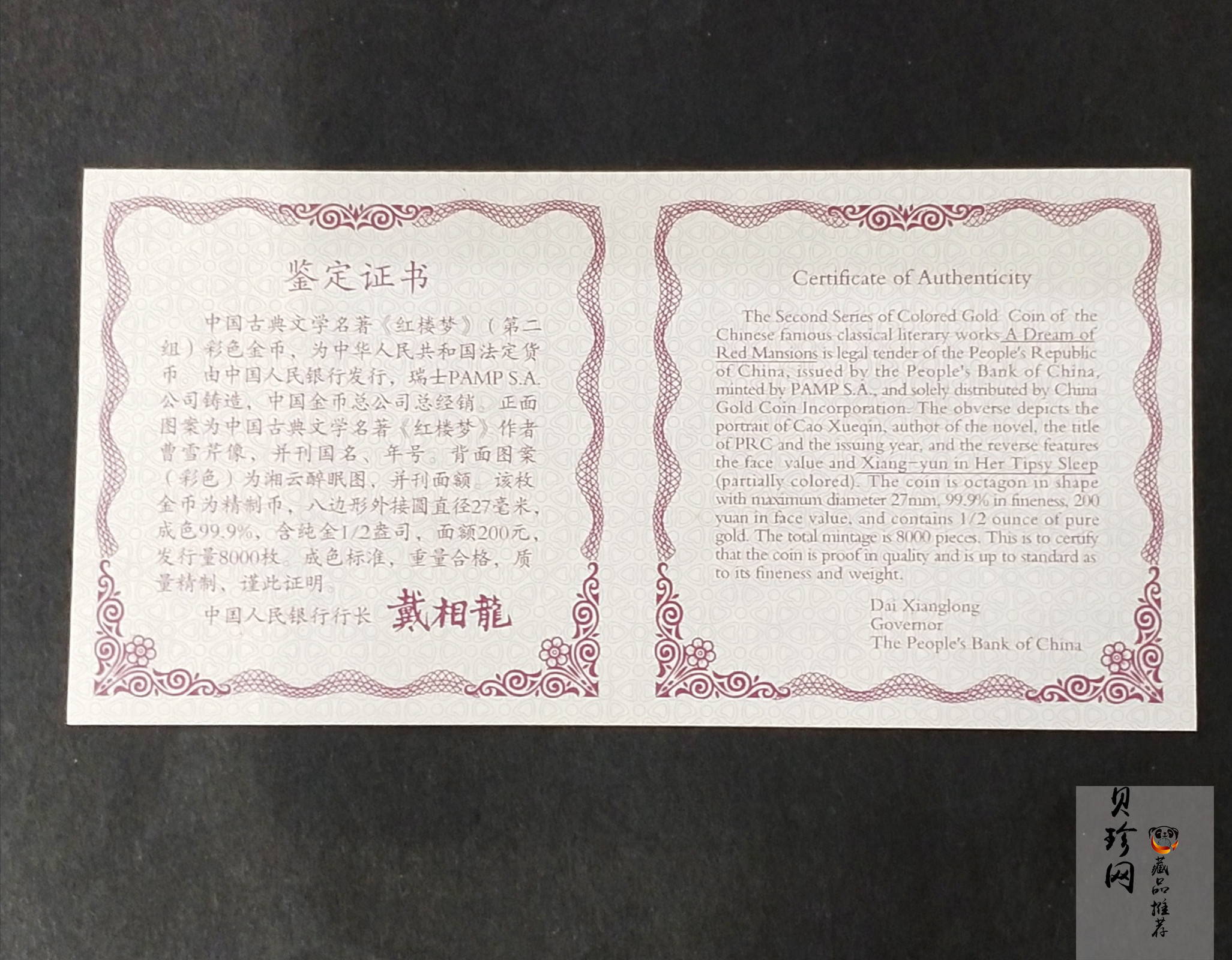 单币:2002年中国古典文学名著——《红楼梦》彩色金银纪念币(第2组)-湘云醉眠1/2盎司彩色精制金币
