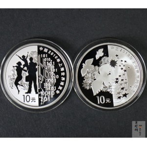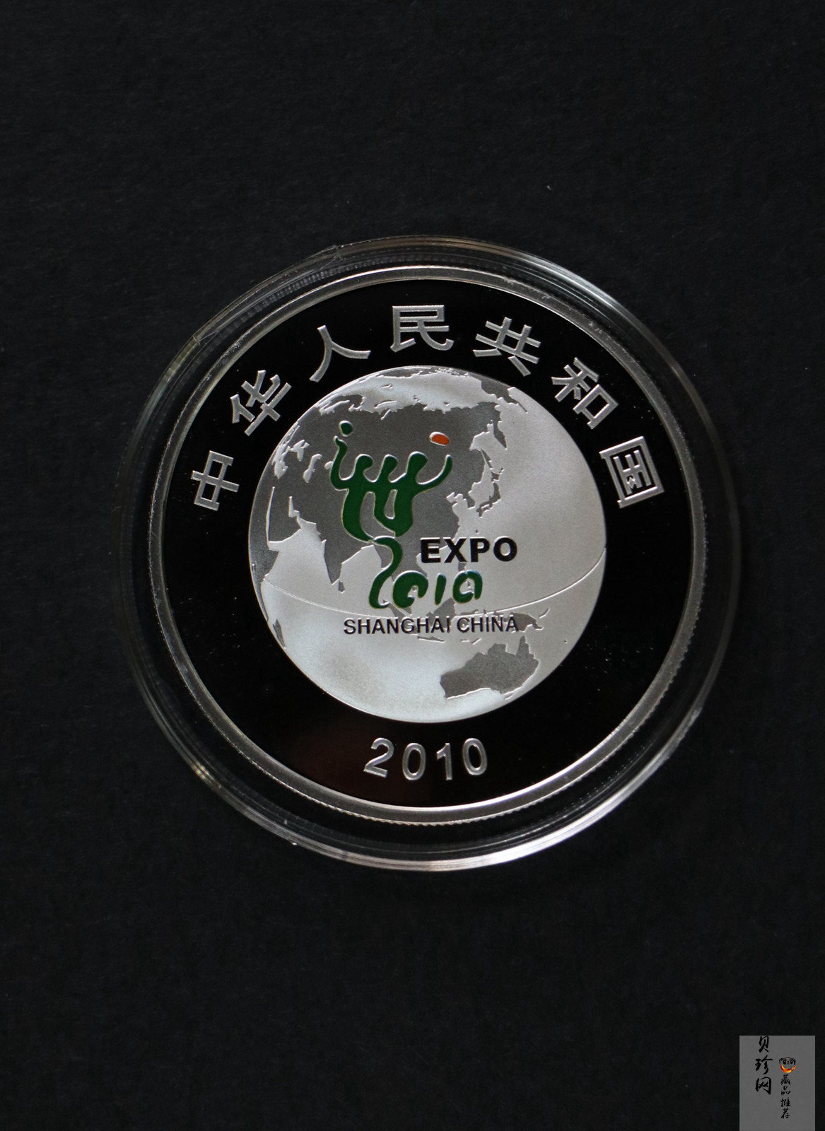在该套纪念币中,有一枚以鸽子为主图案的1盎司银币极富创意。该币的正面图案是中国2010年上海世界博览会会徽衬以地球图案组合设计(局部彩色),并刊国名、年号。地球是我们人类共同赖以生存的家园,这样的设计与搭配既突出了世博会的主题,也彰显出了举办这届世博会的深远意义。在银白色地球的烘托下,彩色的世博会会徽显得生意盎然,灵动跳跃。汉字的“世”与年份巧妙融合,既营造出人类携手发展的美好氛围,也传达出中国人民努力办好本届世博会的强烈愿望。