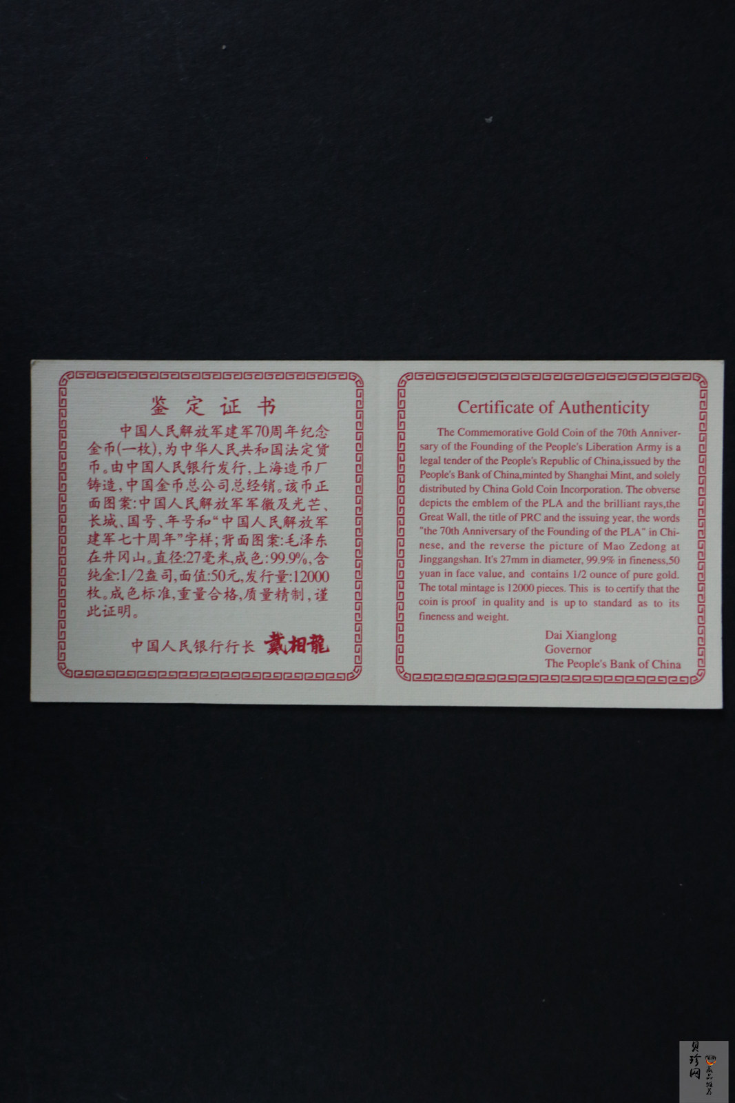 【970801】1997年中国人民解放军建军70周年-毛泽东在井冈山1/2盎司精制金币