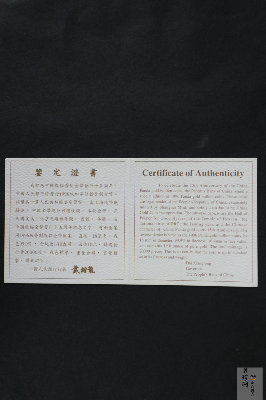 • 【960203】1996年中国熊猫金币发行15周年纪念金币1/10盎司普制金币