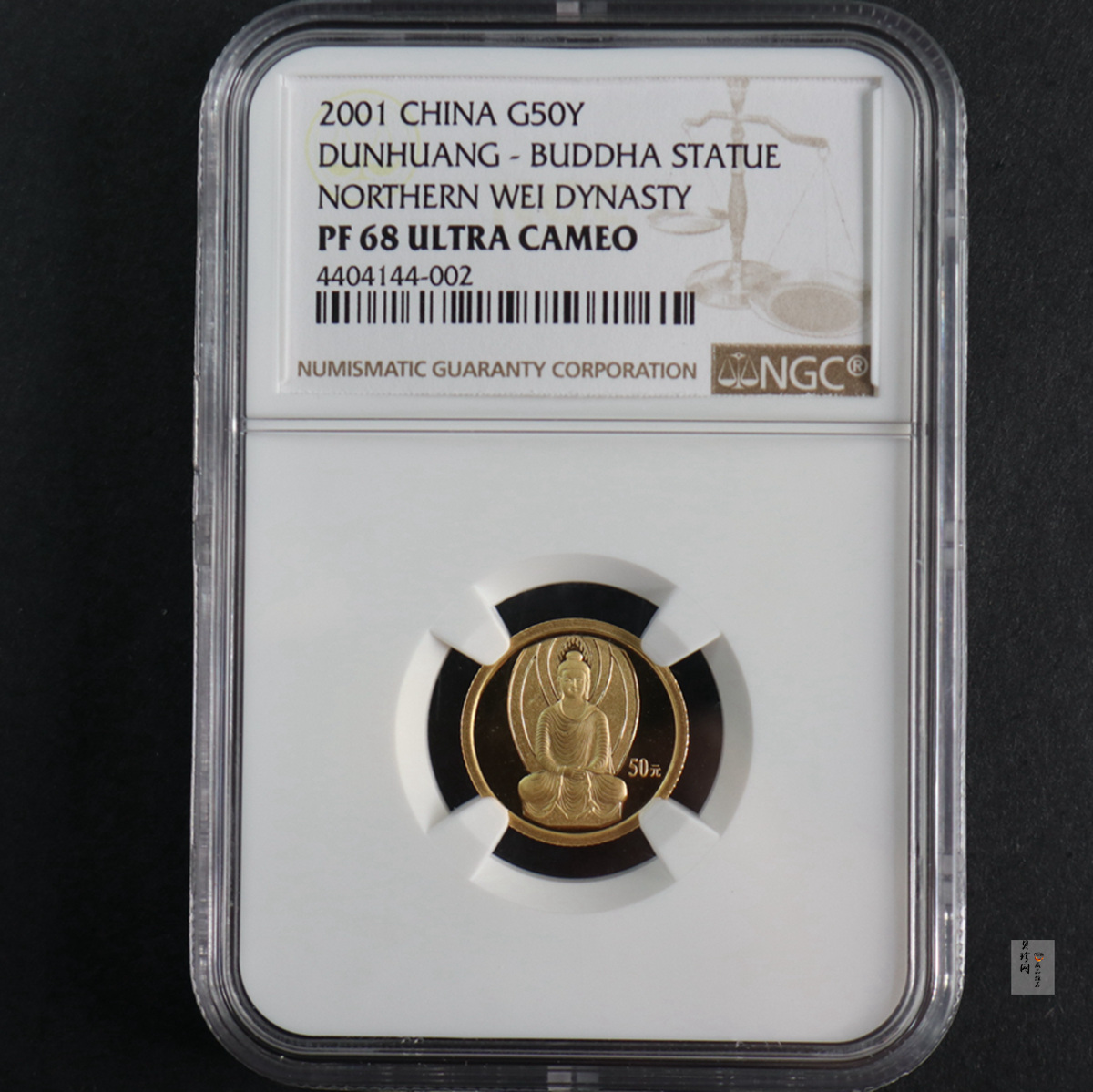 • 【010403】2001年中国石窟艺术(敦煌)金银纪念币-北魏彩塑佛像1/10盎司精制金币