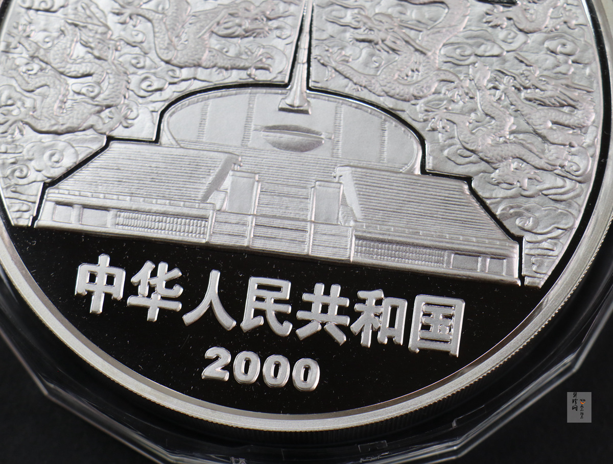 “千年纪念”金银币的正面图案统一采用了胡福庆、刘鸿鹏、储巍合作的设计稿,既然是中国的“千年纪念”题材作品,正面图案为龙就是顺利成章的事情。画面上用繁复的构图刻画“九龙吉祥图”,用简练的构图刻画中华世纪坛。“九龙吉祥图”来源于北京九龙壁,九是中国传统文化中至大至多的象征,虽说是九龙,其实是五爪祥龙群,造型威猛、器宁轩昂、灵珠环绕、须鬃皆张、灵动传神,九龙首尾交连作团龙状。团龙图案在明清两代是等级最高的装饰图案,只能用于宫廷或皇家园林的建筑装饰,同时,团龙也是权势、高贵、尊荣的象征,又有攘除灾难,带来吉祥的寓意。每条龙体型粗壮,体态舒展,苍劲雄浑,曲身张牙舞爪,怒目圆睁,双肩高耸,鼻似如意,扬须摆尾,其足部为五爪,状似翻波搅浪,穿越焰云,气势雄浑,隐隐有吞吐洪荒之万千气象,非绝世高手雕刻不出来这等气势。虽然构图很繁复,但是每条龙刻画得都很细致,龙身雄劲有力,粗身细脖,龙首略小,龙发从两角间前耸,呈怒发冲冠状,张口,龙牙外露,龙眉向上卷曲,龙爪呈轮状,龙尾修长卷曲,对于龙纹的每一细部雕刻得入木三分。有三处细节处理得堪称完美:第一处,五爪在封建社会中代表着帝王,而诸侯贵族等最高只能使用四爪,这里刻画的正是代表古代帝王之尊的五爪神龙;第二处,角似鹿,头似驼,眼似兔,项似蛇,腹似蜃,鳞似鱼,爪似鹰,掌似虎,耳似牛,龙之“九似”特点鲜明地表现出来了;第三处,龙身的盘曲伸张与每条龙之间的首尾交连,恰好形成了“一波三折”的曲线,契合着中华民族所尊崇的空灵、曲折、变化的境界。构图饱满开阔,庄重大气,不仅显现着中国先民绮丽的想象力,隐隐有汉唐雄风,由此唤起人们一种对“龙”的朝圣般虔诚和对华夏厚重历史的仰望。