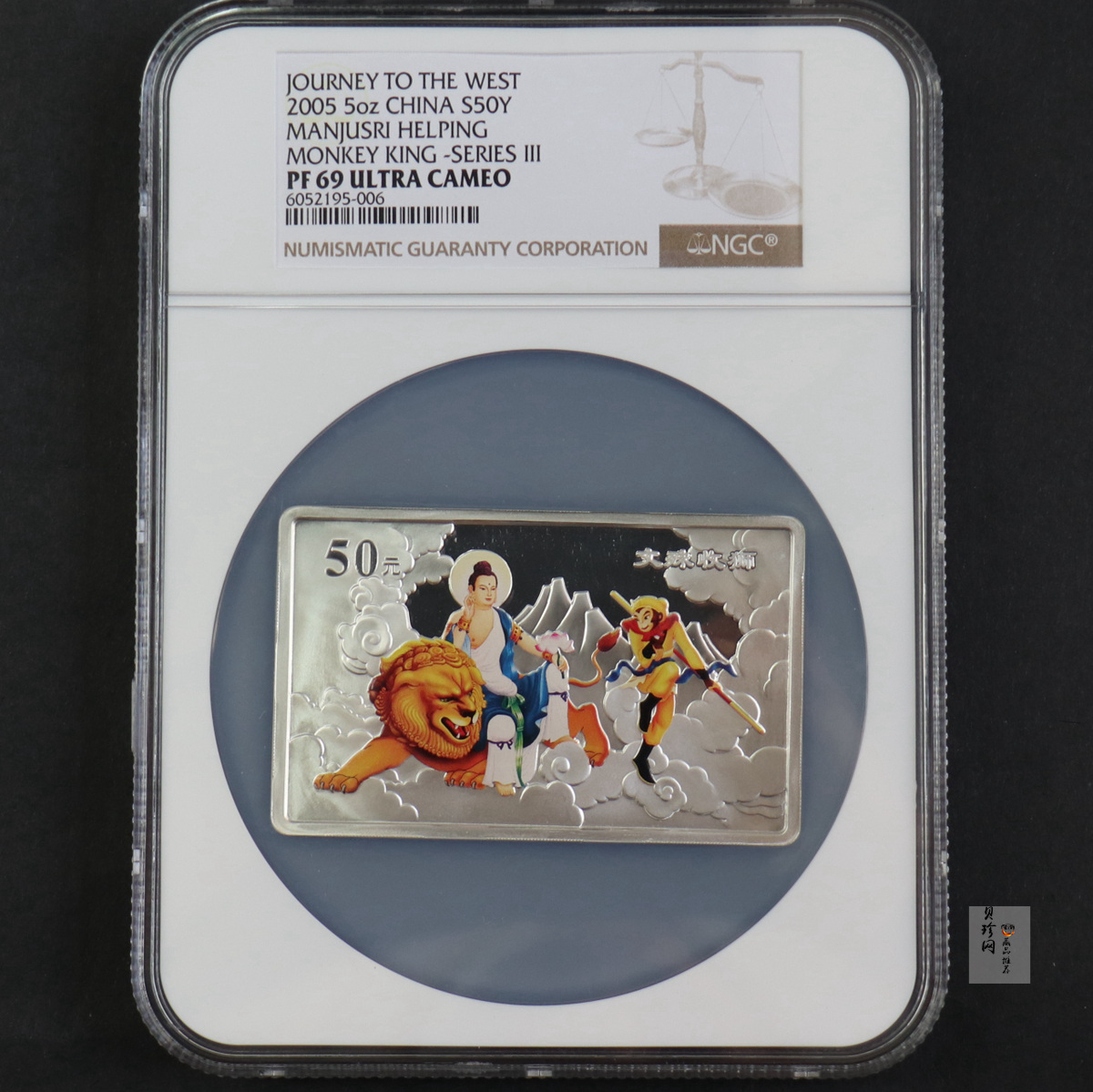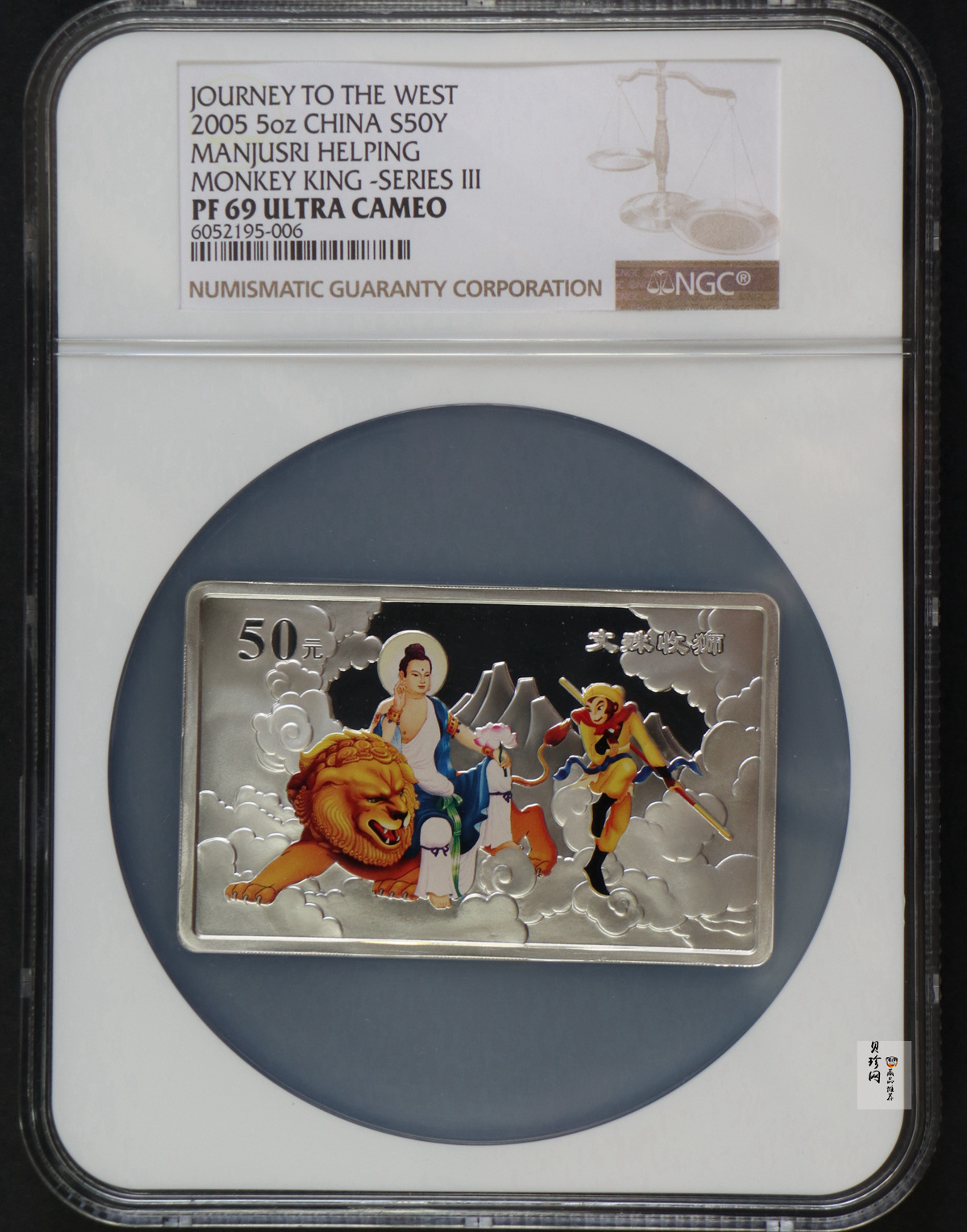 “文殊收狮”银币的立意与布局拥有独立的图式,延伸了文殊菩萨气质中内敛的一面。另一方面,国画最讲究线条,无论是空间的分割还是画面整体的布局,包括设计者的情感都通过流动的线条凝聚在刀笔上,它们赋予了画面以多重意趣。画面各个元素搭配互为依托,文殊和金狮所占画面和悟空的形象平分秋色。