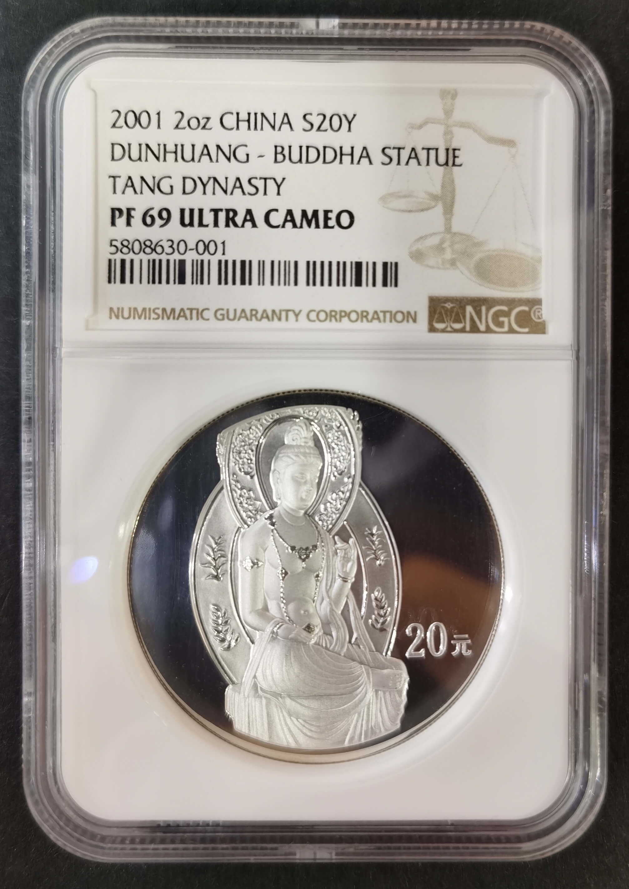 单币:2001中国石窟艺术(敦煌)金银纪念币-盛唐菩萨像2盎司高浮雕精制银币