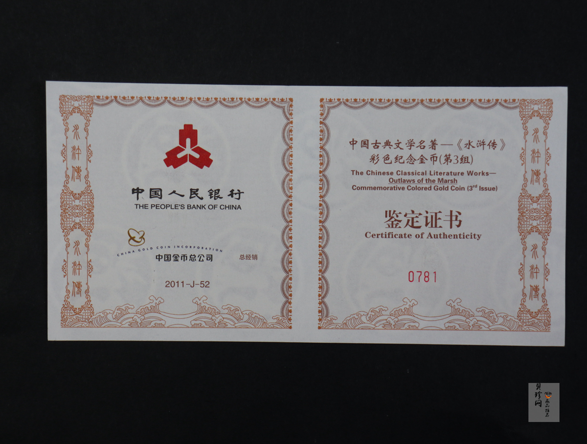 “中国古典文学名著——《水浒传》”彩色金银纪念币自2009~2011年共发行了3组,币面设计基本按原著重要章节依次设计,因此,这个系列纪念币会以“精缩版”的“小”《水浒传》面貌呈现,达到对中国古典文学名著时代特征、文化意义、艺术魅力的传承与再现。中国金币“传承文化淬炼金银”的品牌精神在这些拥有强大文化容量与民族文化魅力的题材里也获得了巨大的声誉。
