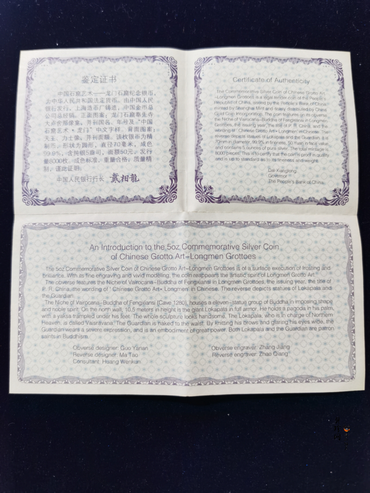 【020504】2002年中国石窟艺术(龙门)金银纪念币-天王、力士像图5盎司精制银币