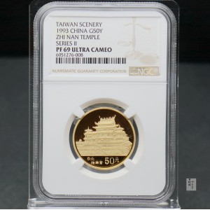 同样的“台北指南宫”图稿,金与银的材质不同,视觉效果也有一定差别。金币之上,设计雕刻的精密与周密,具有金碧辉煌的冲击力。而在银币上,它则让我们感受到建筑结构的精巧细致,感受到它穿越时空的文化与历史价值。台北指南宫建筑群中,凌霄宝殿以道教为主,大雄宝殿主祀释迦牟尼佛,大成殿则供奉至圣仙师孔子。在台湾,这也是少见的儒释道三教同体的庙宇。