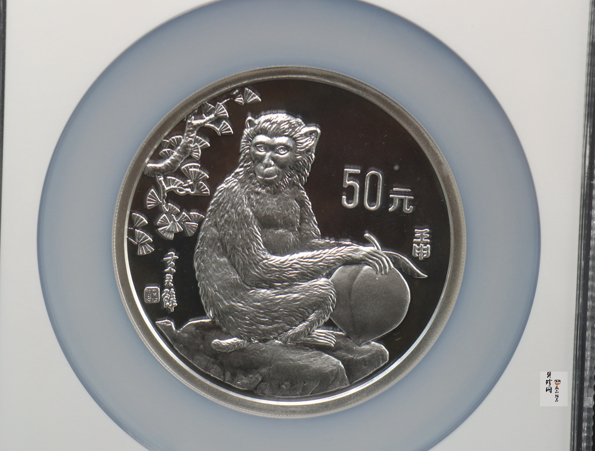 在金银币的画面中,一只老猴蹲坐于石上,正脸侧坐,双目圆睁,瞪着画外的看众。双手捧扶住一只圆润的寿桃,一丛松枝倾斜安置于币面左侧,从下往上自然生长,使画面达到视觉上的均衡感和空间上的纵深感。雕刻的老猕猴栩栩如生,毛发清晰可见,非常可爱,贴切地表现了渴求多福长寿的寓意。桃子自古以来就被视作延年益寿的果品,并且被加以渲染神化,形成了一种独特的“寿桃”文化。