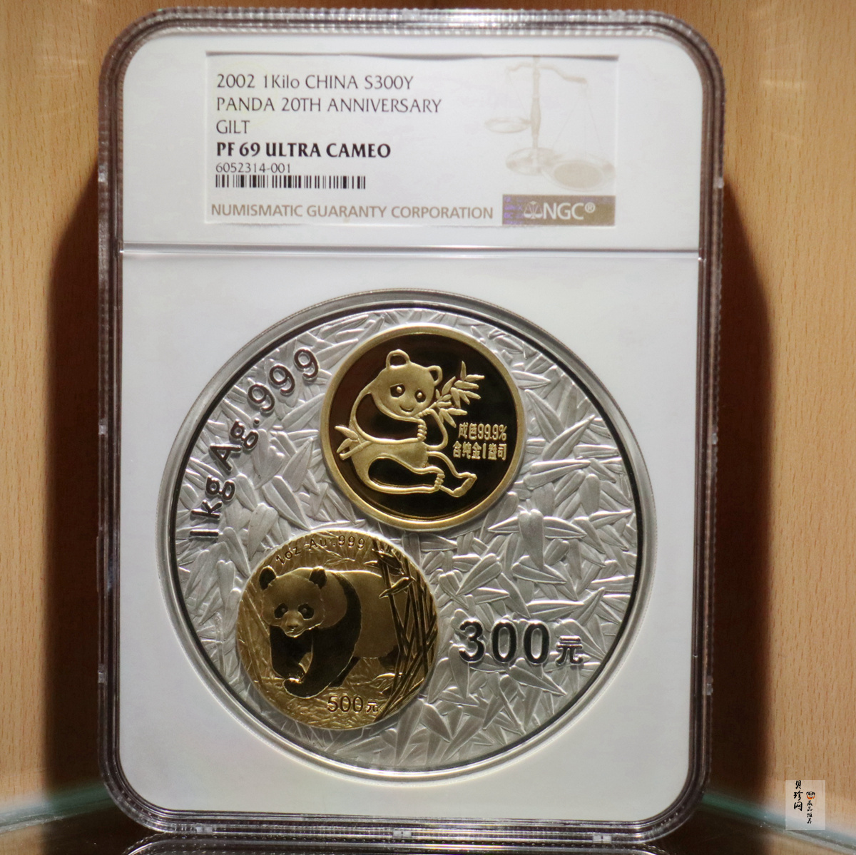 单币:2002年中国熊猫金币发行20周年银铂纪念币1公斤镶金银币
