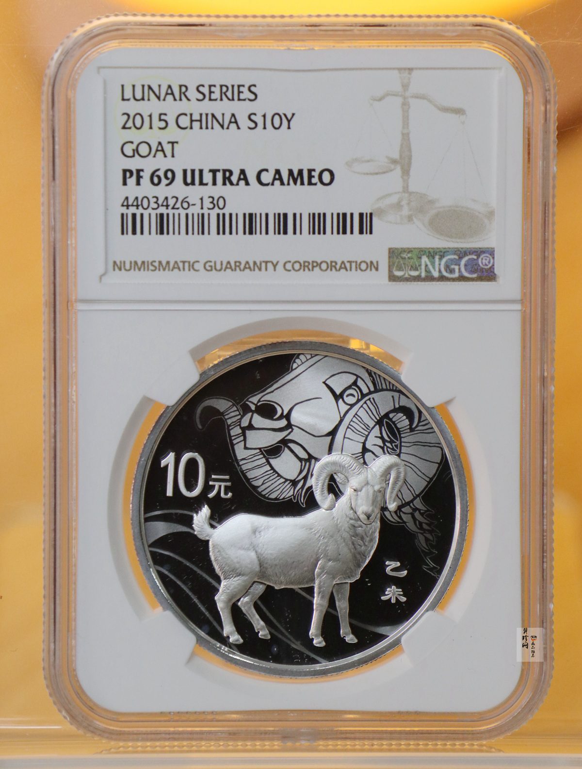 彩色金银币上,一只传统装饰造型的山羊,常见于剪纸、年画、皮影、泥塑等,承载着中国民俗文化的精华,是春节等传统节日欢乐气氛里必不可缺的喜庆元素。山羊是人类最早驯化饲养的动物之一,遍布中华大地,“羊大为美”,在古代中国,羊多、羊肥是生活富裕的象征。
