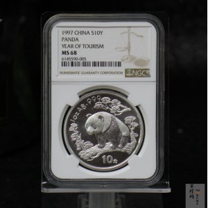 中国人民银行发行“中国旅游年”纪念银币,为“熊猫”加字系列之一。加字母体为1997版“熊猫”1盎司普制银币。背面图案雕刻为沈阳造币厂谷英斌。正面图案沿用孙奇龄设计的“北京天坛祈年殿”图稿,外环分上下两个区域,上为“中华人民共和国”国名,下又分左右,左为中文“97中国旅游年”,右为英文“VISIT CHINA 97”。设计为沈阳造币厂张文竞。