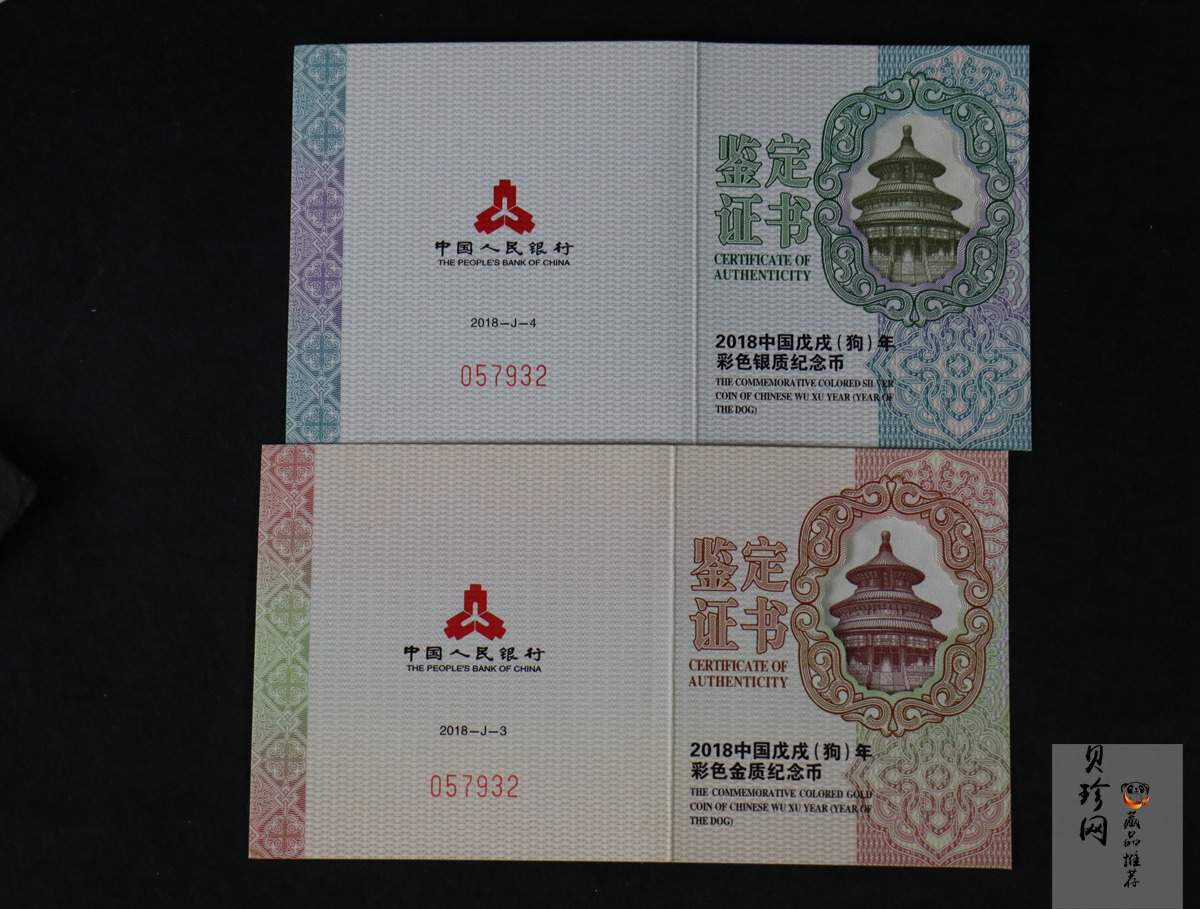 该套金银纪念币正面图案均为中华人民共和国国徽,衬以连年有余吉祥纹饰,并刊国名、年号。背面图案均为写实狗造型,衬以装饰狗纹样,并刊面额及“戊戌”字样。