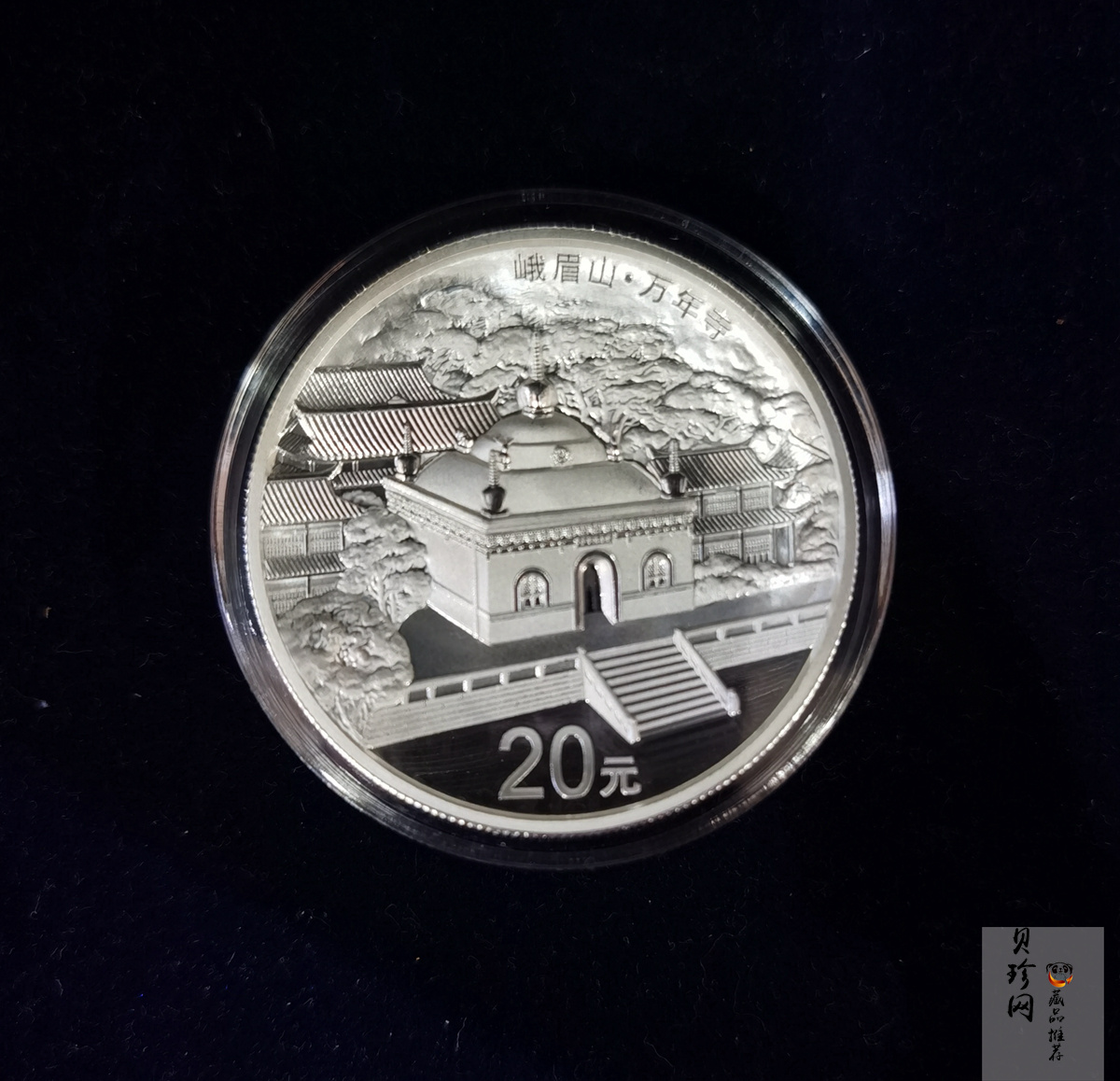 2盎司银质纪念币的背面图案为万年寺景观造型。万年寺是峨眉山历史最悠久的古刹之一,殿宇七重,规模宏大,是现在仅存的一座明代无梁砖殿。殿壁、殿顶,甚至门楣额枋、斗拱、窗棂皆为砖砌,全殿无梁无柱,不用一木,故称“无梁殿”。