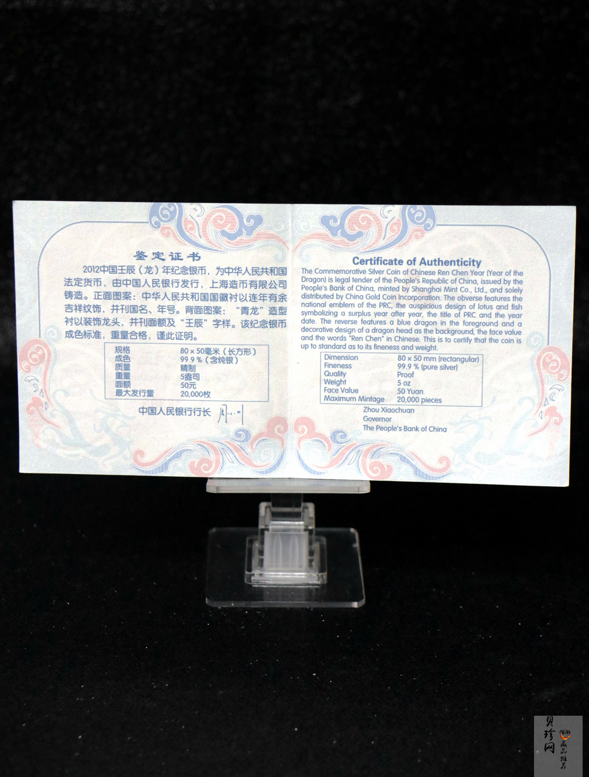 • 【111510】2012年壬辰龙年生肖5盎司长方形精制银币