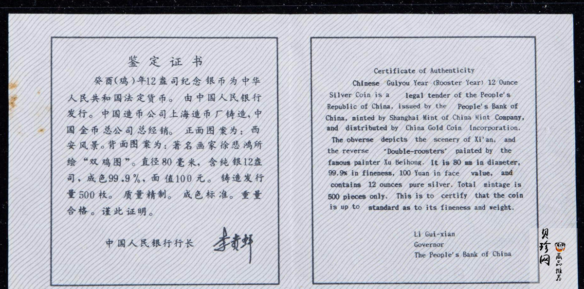 我们在对中国传统文化的理解上,有一种尊崇“模糊”的意识,所谓“言有尽而意无穷”,表现在中国国画艺术里就是虚与实的处理方式。这不仅仅是一种几何构成,不是死的空间形体。在“双鸡图”金银币的画面上,一对雄鸡隔着一块大石,高低相望,振翅扬尾。石下一鸡引颈高歌,石上一鸡低首静听。