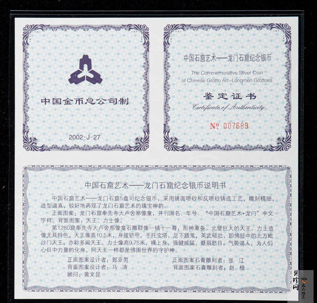 【020504】2002年中国石窟艺术(龙门)金银纪念币-天王、力士像图5盎司精制银币