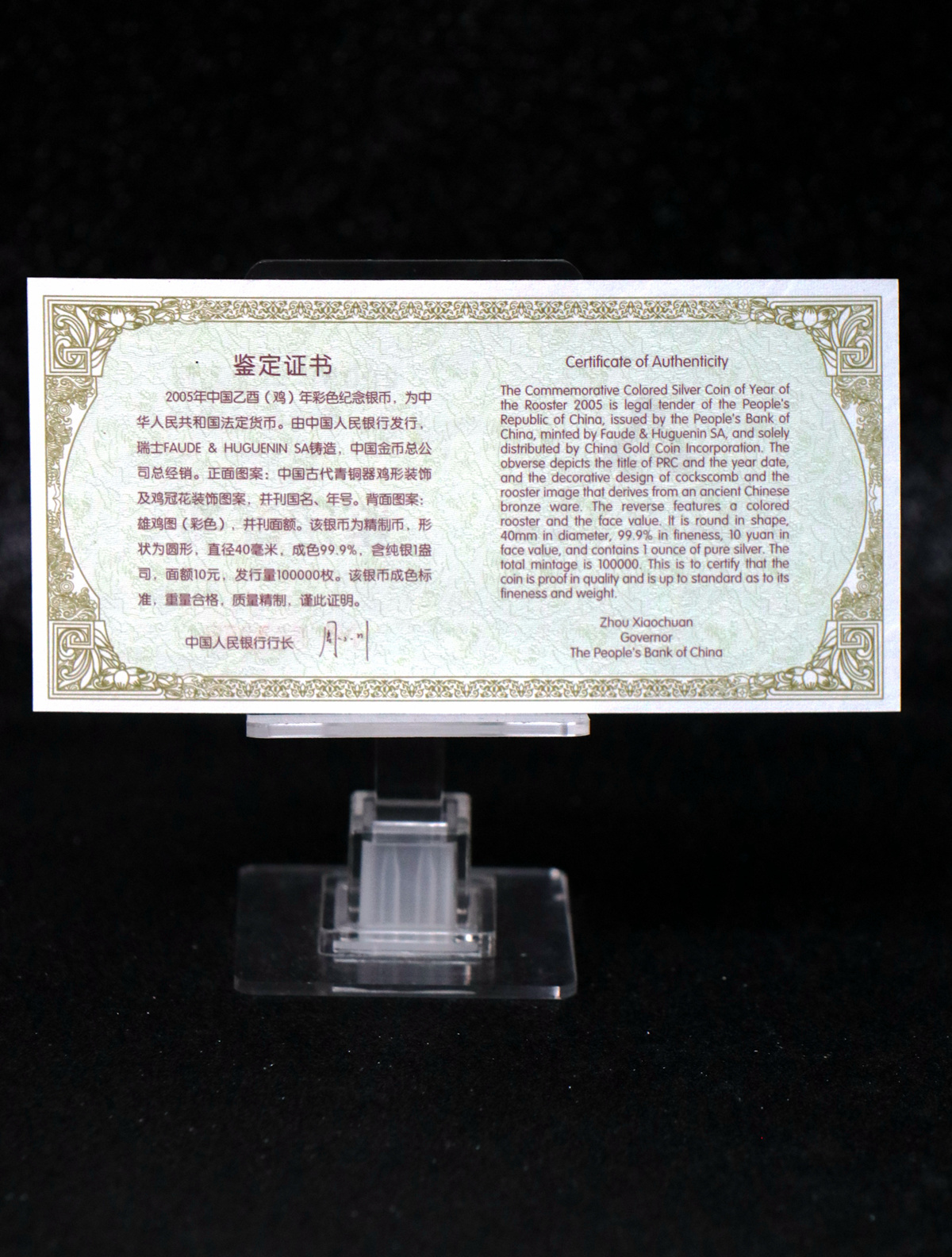 单币:2005年乙酉鸡年生肖1盎司精制彩银币