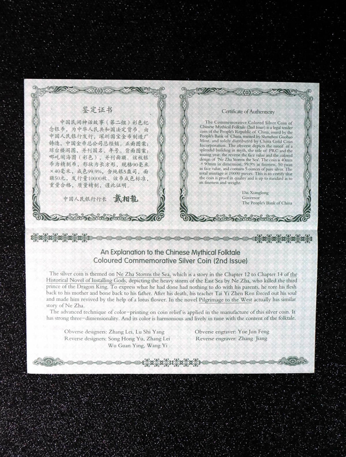 “哪吒脑海”银币是惊艳之作,惊艳来自两个层面,人物“哪吒”的神,事件“脑海”的韵,通过浮雕看似简约的刻绘,通过色彩几近华丽的描述,达到了相应的极致。