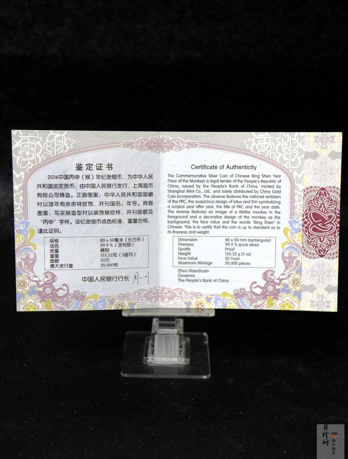 【151410】2016年丙申猴年生肖5盎司长方形精制银币