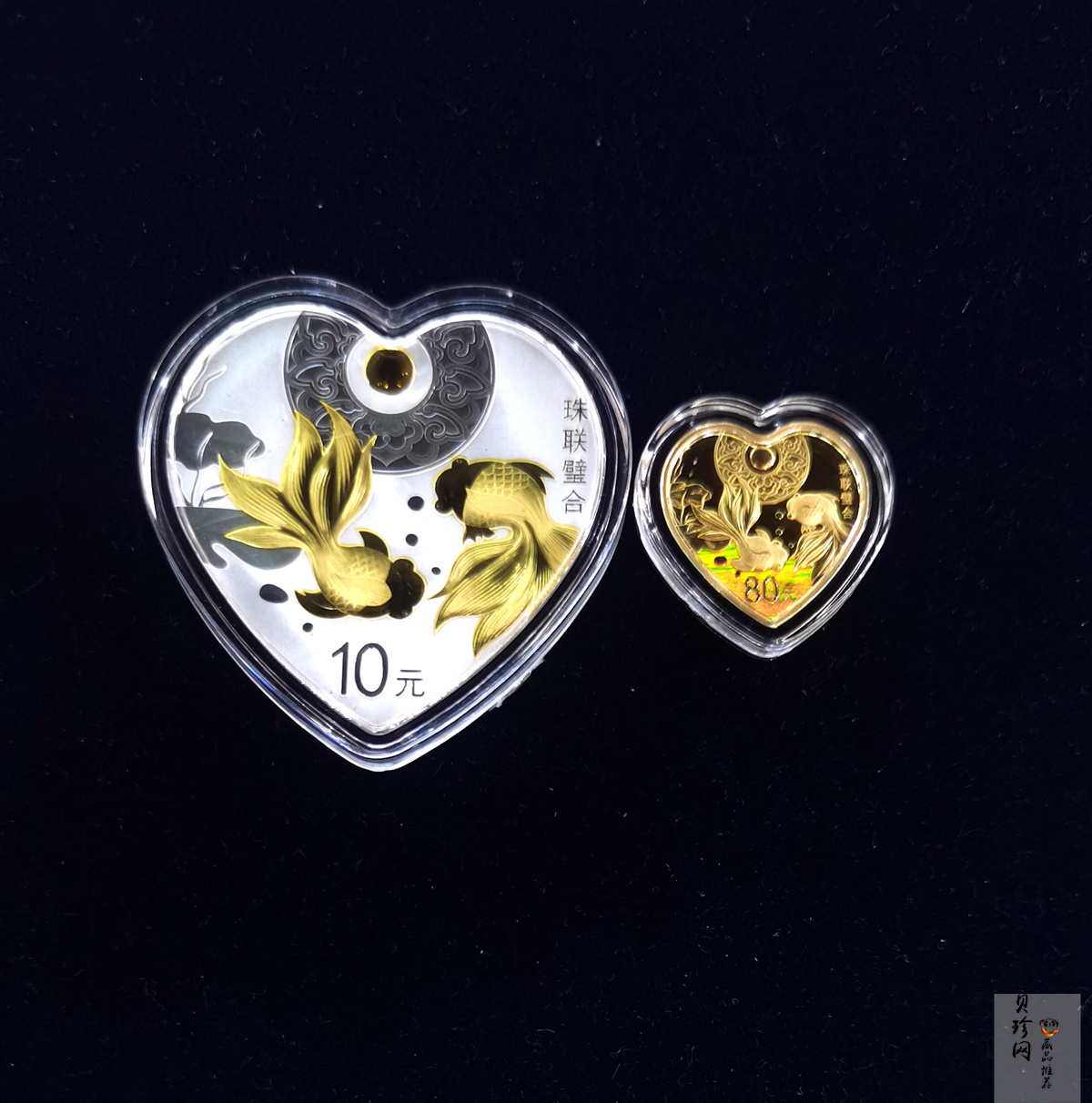 2018年5月18日吉祥文化“珠联璧合”金银纪念币隆重发行,看到这组金银币的时候,我突然想到了以前看过的一部动画片《渔童》:老爷爷从江里捞上一个渔盆,到了晚上,渔盆里的一切都复活了,渔童站在莲蓬上一边跳一边唱:“清水清水流流,金鱼金鱼游游,金鱼金鱼跳跳,清水清水冒冒,”随着金鱼跳起,溅出的水滴就变成了一颗颗晶莹的珍珠。那时自己梦想着要是有这么一个神奇的渔盆该有多好。今天,金鱼、莲叶来到了“珠联璧合”纪念币上,其中银币为凹面设计,神似记忆里的渔盆,梦想终于可以成真了。