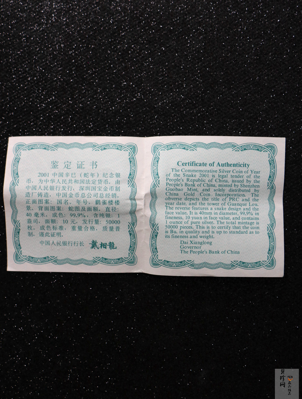 【010210】2001中国辛巳(蛇)年金银纪念币-盘蛇图1盎司普制银币