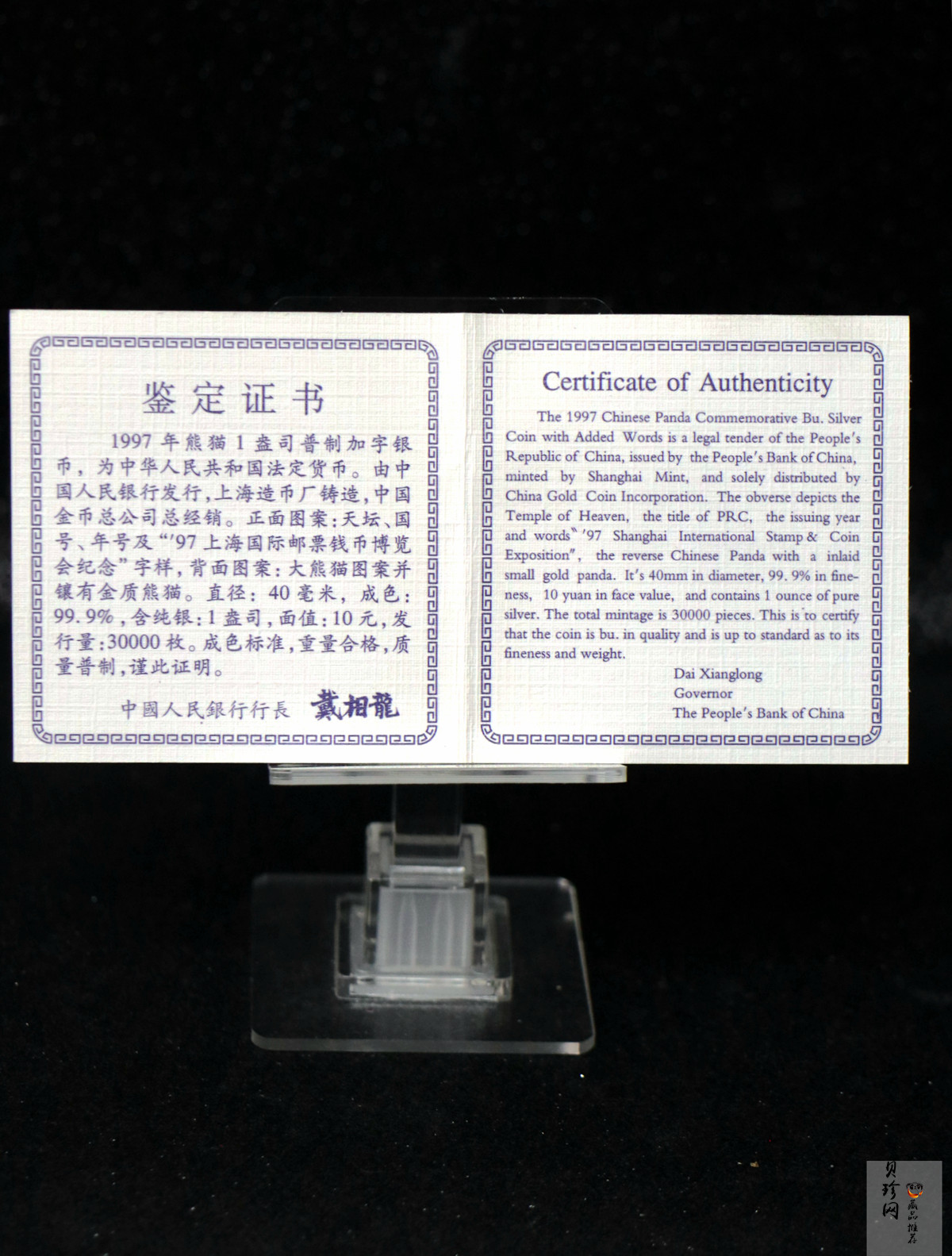 中国人民银行发行“1997上海国际邮票钱币博览会”纪念银币,依旧为“熊猫”加字,母本为1997版“熊猫”1盎司普制银币,制作延续“1996北京国际钱币博览会”设计与加工,继续采用了镶嵌工艺。其式样,同样为“银镶金加字熊猫币”。