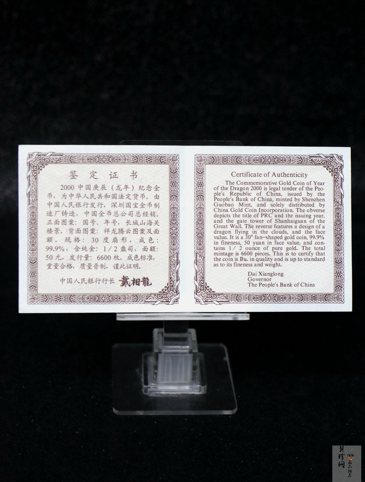 【000304】2000中国庚辰(龙)年金银纪念币-云龙图1/2盎司扇形精制金币