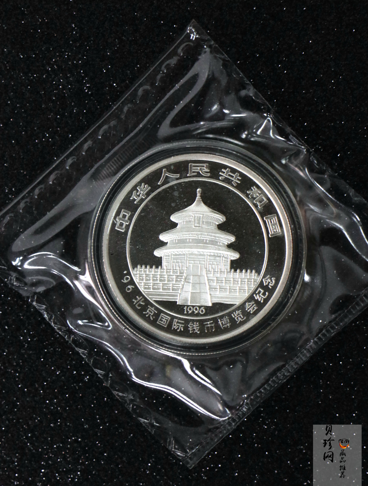 “1996北京国际钱币博览会”纪念银币依旧为“熊猫”加字性质,其母本为1996版“熊猫”1盎司普制银币。其中“1996北京国际钱币博览会纪念”加字,镌于正面图案“北京天坛祈年殿”的外环。背面图案设计与雕刻为上海造币厂顾杏宝。但与1995北京国际邮票钱币博览会纪念银币不同,该银币另外采用镶嵌工艺。在币面右上端,面额“10元”之上,镶嵌有一款缩微金币,图案接近,由胡福庆设计,余敏雕刻,无面额。
