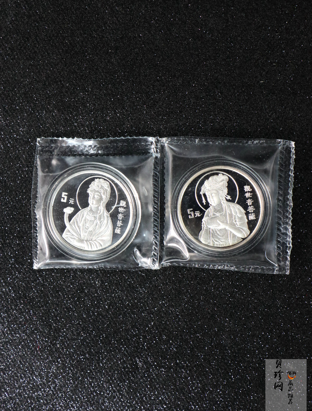 金轮观音:1995年“观音”金银纪念币背面图案的4幅图稿,均由美国天坛钱币公司刘建雄提供,清一色为善目低眉的半身法相。其中“莲花观音”图稿为正面直视,另外三款,包括郁友奎创作的“金轮观音”金银币在内,都带有一定斜度的左侧。虽大同,但小异,且各有“异”的特点与风格,再加上设计师不同的认知与不同的创作理念,最终表现出的“观音”,便有强烈的个性和不同风采。