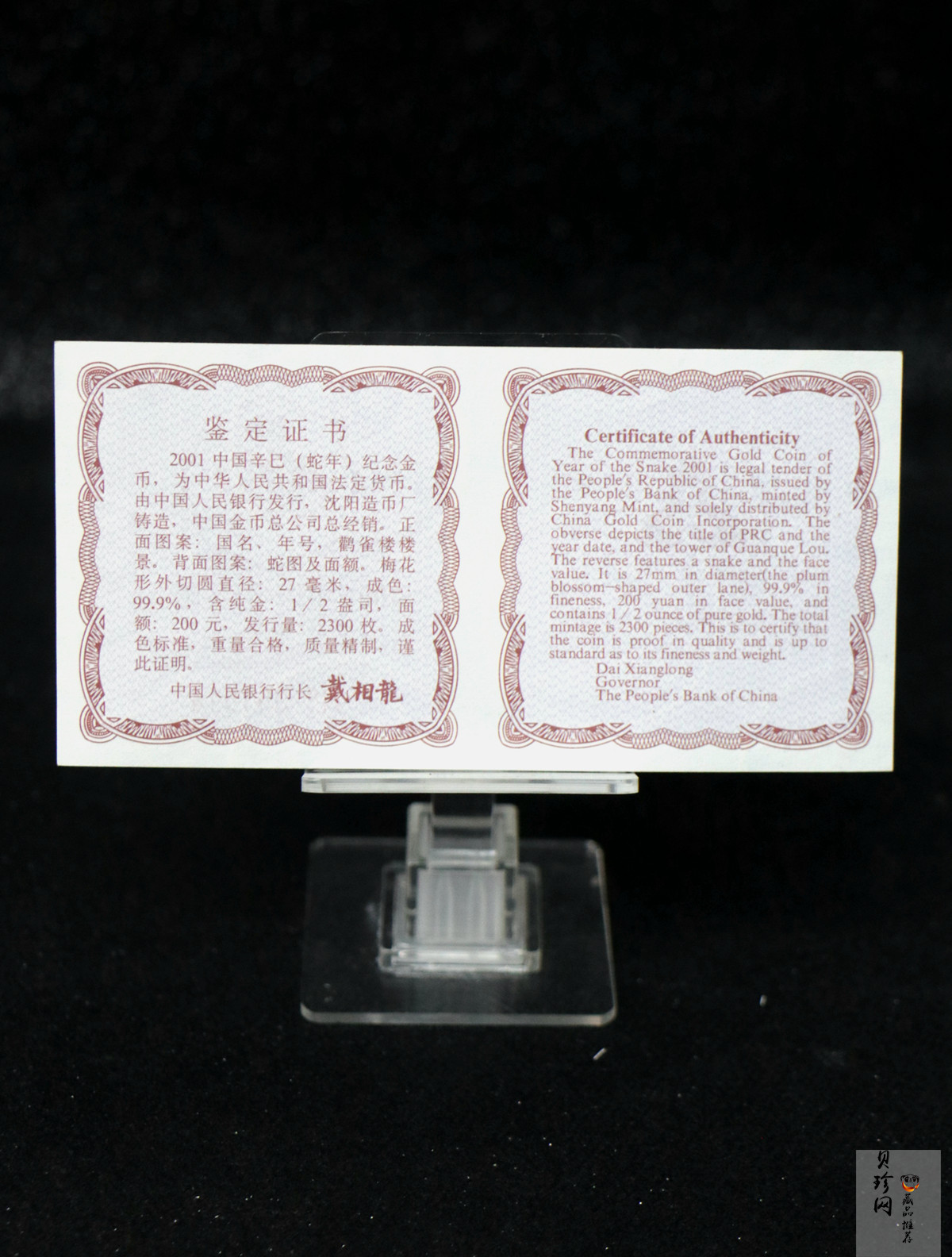 【010204】2001中国辛巳(蛇)年金银纪念币-游蛇图1/2盎司扇形普制金币