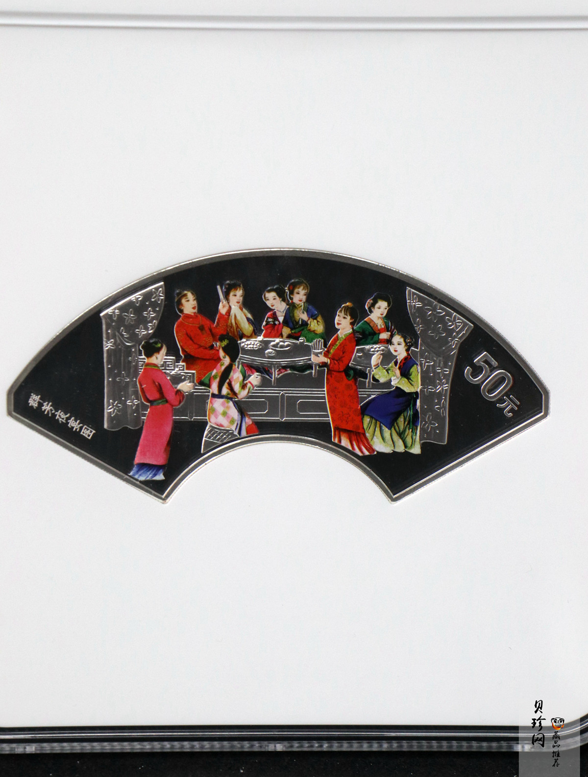 “群芳夜宴”的币制为扇形,它与银币内容的表现达到了完美结合的程度。扇形形制不仅极为符合币面构图的需要,同时,也充分显示出现代贵金属币形制的重要性和丰富性,从而也增加了集藏的乐趣。币面展现的群芳夜宴场景,由于人数众多及表现故事场景的需要,扇形形制显得得天独厚,不仅使币面在空间上得以从容延展,更似一卷画轴徐徐展开,在内容上丰富了币面画面的叙事性。设计者落笔时,各个人物的神情姿态都获得了充分的表现,这就得益于扇形形制的延展性。