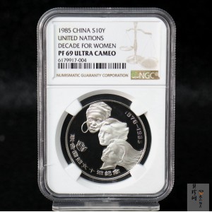 1985年是联合国妇女大会十年的特殊日子,为纪念这一历史时期,中国人民银行于该年发行联合国妇女10年纪念银币一枚。联合国妇女10年纪念银币正面图案为国徽图案、两边饰有两只左右对称的凤凰纹样,并刊国名、面额;联合国妇女10年纪念银币背面图案为黄、黑、白三色人种的女性头像,头像右上方刊有“1976-1985”年号,主图下方刊有“联合国妇女十年纪念”字样,字样上方是和平鸽的会徽。联合国妇女10年纪念银币为精制币,含纯银1/2盎司,直径36毫米,面额10元,成色92.5%,发行量为4000枚,由上海造币厂铸造。主题形象是三位不同种族但同样美丽淳朴的妇女,她们脸上绽放出灿烂的笑容,彷佛这一幸福时刻永远的被定格在联合国妇女10年纪念银币上。简单的构图、精美细致的雕刻、但极富深刻的内涵。她们虽然来自不同国家,不同民族,有着不同的肤色和价值观,但是她们的心是相通的,连在一起的,我们希望生活在地球上任意角落里的人们都应该尊重每一位妇女,妇女也拥有被平等待遇的权利,无论语言、肤色、信仰不同,但这都不是阻碍妇女获得拥有自由、平等与公正的权利障碍。