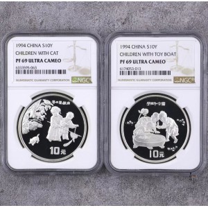 套币:1994年中国古代名画婴戏图-冬日戏猫图、子孙和合图纪念银币两枚一套