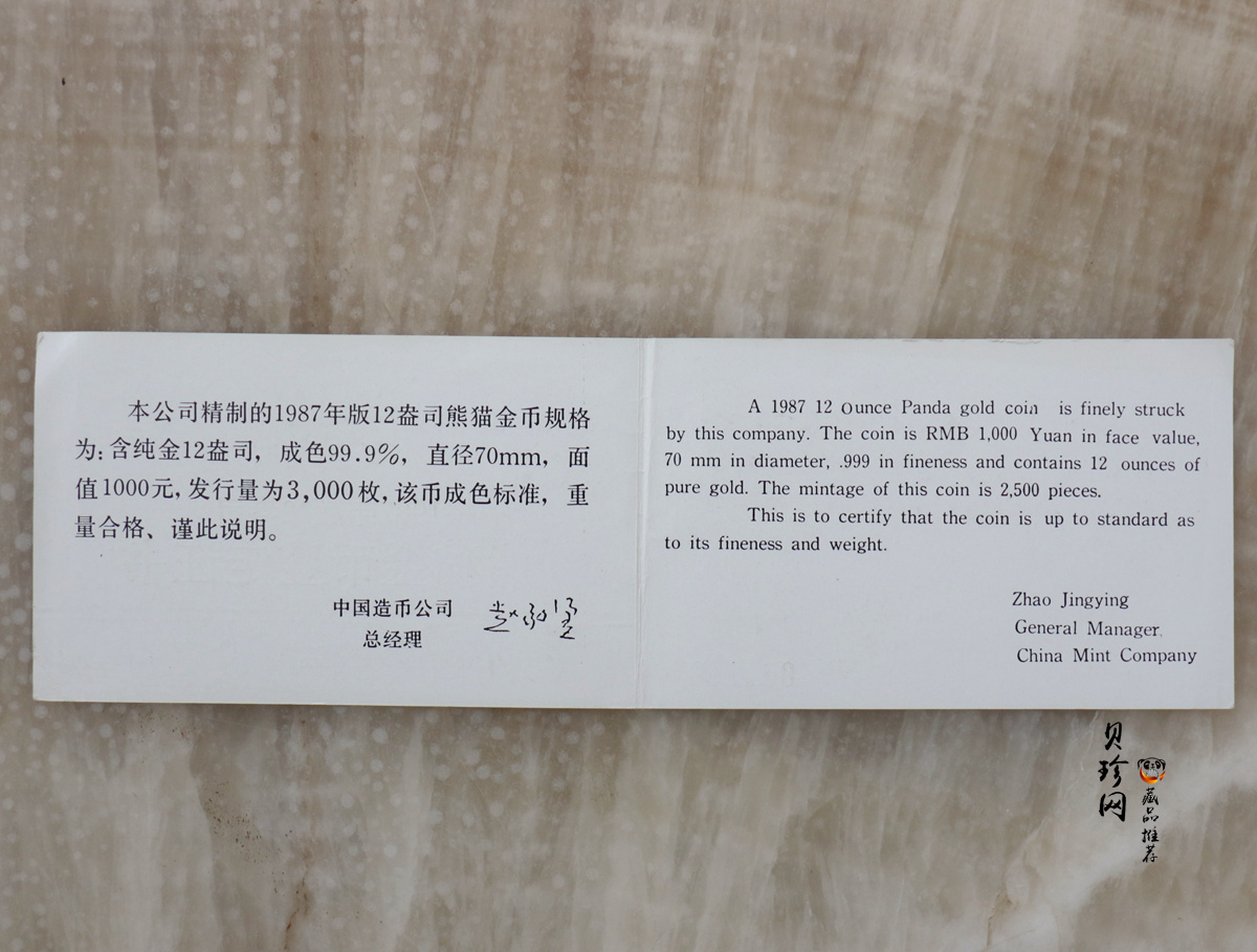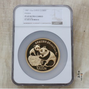 《货币贵族——中国现代贵金属纪念币》一书中提到,1987版“熊猫”币在生产工艺上创造了两个第一:一个是首次采用贵金属铂发行了一枚圆形的1盎司精制“熊猫”铂币,填补了中国金银纪念币的材料品种的空白,给钱币收藏界增添了一股新贵;另一个是在该年版“熊猫”金币上首次标注生产厂家的符号,篆刻于“熊猫”图案的右下方。