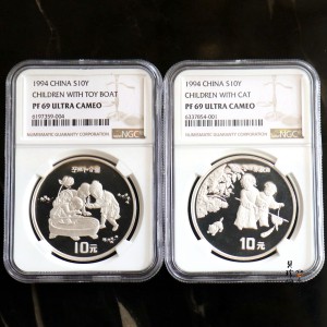 套币:1994年中国古代名画婴戏图-冬日戏猫图、子孙和合图纪念银币两枚一套