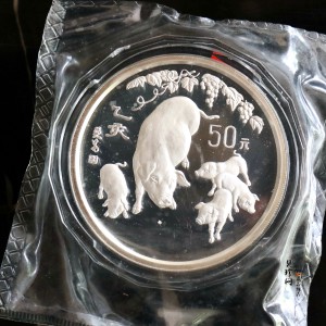 王德福通过贵金属语言表述的又是另外一番情调。装饰性的画感非常易于衬托现实生活的表达。母猪细长而短小的尾巴在画中只是轻轻地一笔带过,看似随意的那么一笔,在币面上着力并不能那么随意。若绘画采用写意画法,一路笔墨开道画将去,所谓意到笔到,大可率性而随意;而雕刻一法在于写实,也就是刀刀见工,笔笔都得有交代,要看得见摸得着,因此必得随行勾画,浮雕的立体感显现出猪的活泼动态,这一动感表现的画龙点睛之笔,仅因此一处的变化,就使画面大展生机,大有围棋“一子动满盘皆活”的味道。此外,体形的作态、身形的扭曲,都配合雕刻所需的动感做得恰到好处。何况这本就是浮雕“动”之物的画作,举其一点,就足以证明雕刻之中亦有“四两拔千斤”之功力。