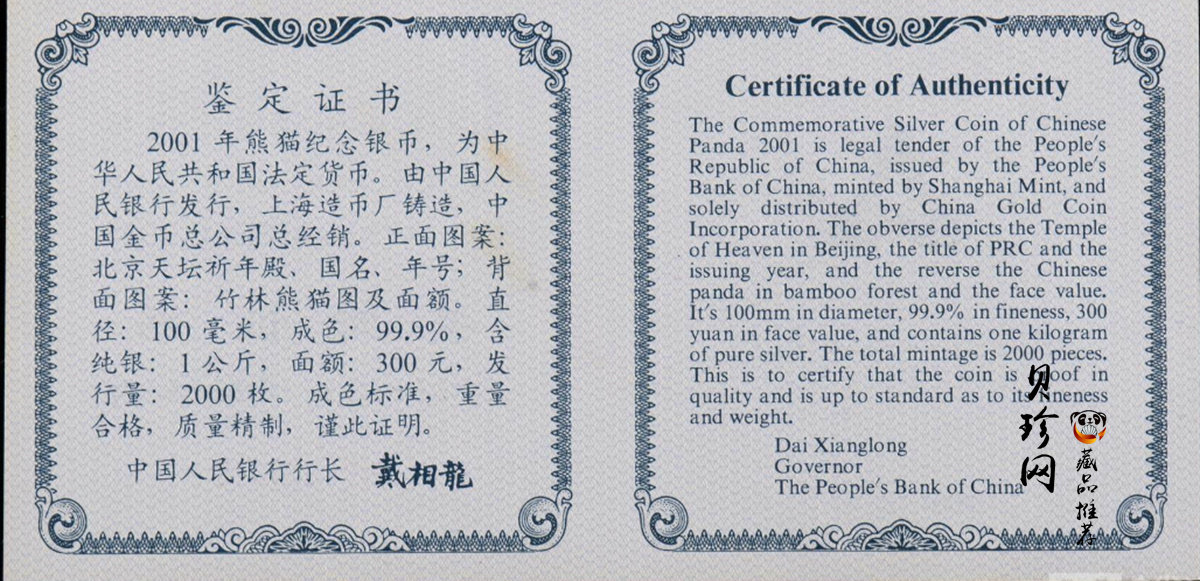 2001版中国“熊猫”1盎司金币,荣获了2003年度“世界硬币大赛”最佳金币奖。同时,在2001年新加坡举办地亚洲货币展上,获得“最受欢迎的钱币”奖。