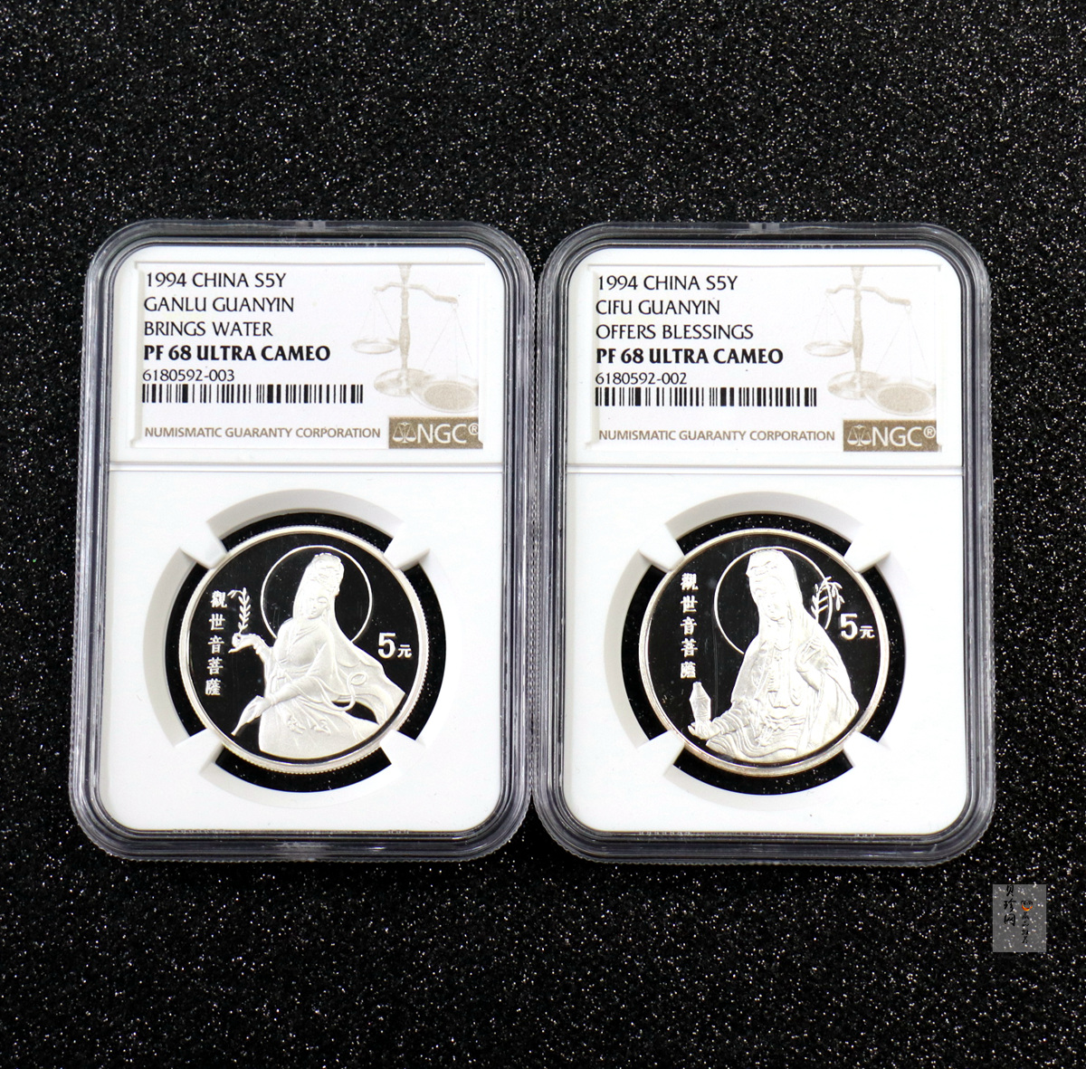 送子观音:慈眉善目,充满世俗人格化色彩是1994年“送子观音”金银币最突出的神韵。“千处祈求千处应”是观音信仰的核心,作为民间创造出来的“送子观音”,是民间伦理“多子多福”的印照,愿大慈大悲观音菩萨保佑,赐予信徒子孙满堂,香火旺盛,家族锦延。