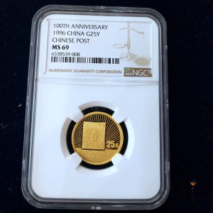 中国邮政100周年纪念币,为中华人民共和国法定货币。由中国人民银行发行,沈阳造币厂铸造,中国金币总公司经销。本枚银币,正面图案:“特1”国徽邮票及中文纪念字样、国徽、年号,背面图案:清代团龙邮票及英文纪念字样。直径:22毫米,成色99.9%,含纯金:1/4盎司,面值25元,铸造发行量3000枚。成色标准,重量合格,谨此证明。