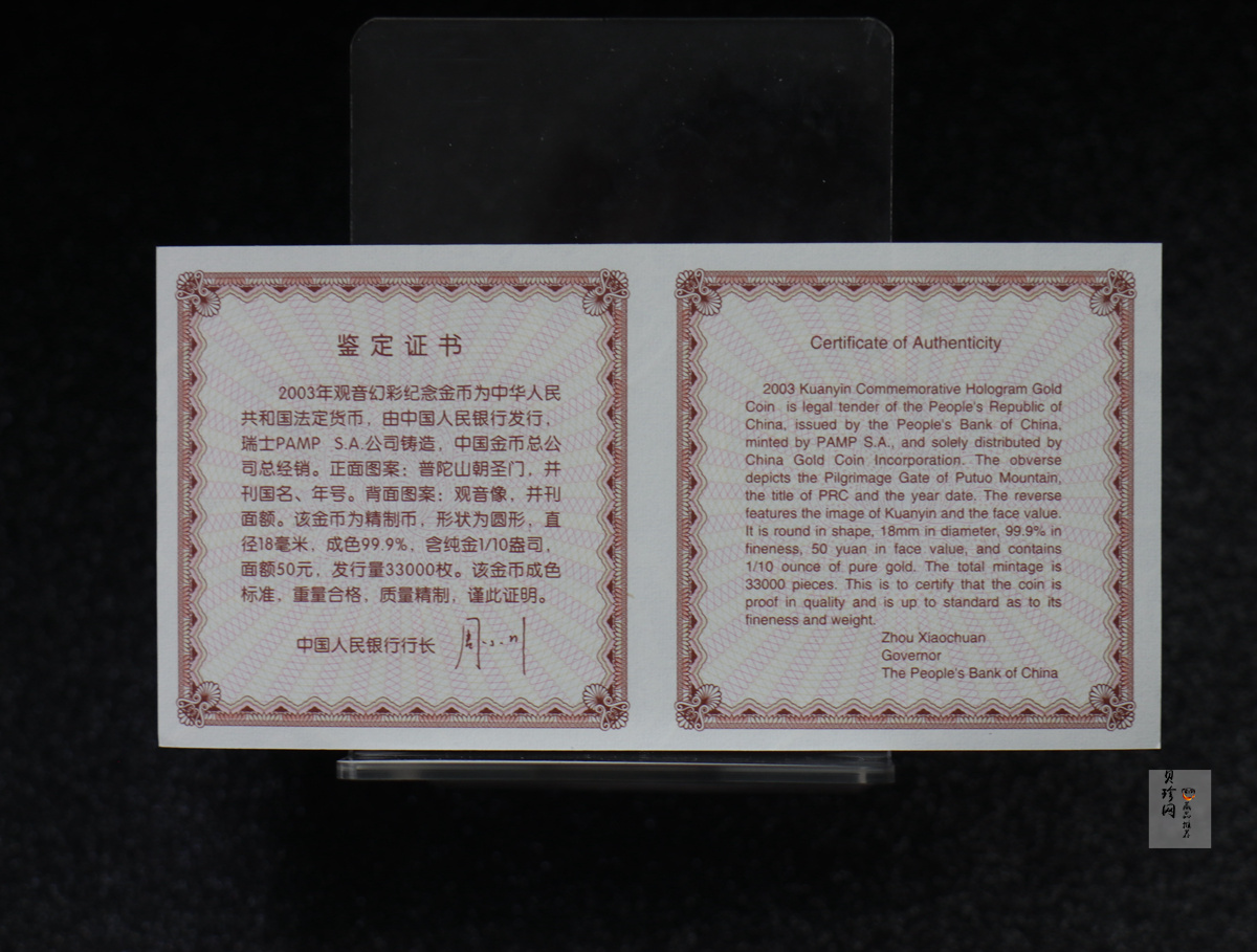 • 【031001】2003年观音纪念币-观音像1/10盎司圆形幻彩精制金币