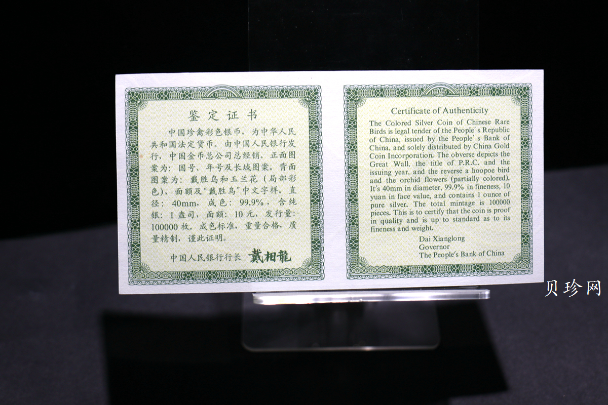 单币:2000年中国珍禽系列(戴胜鸟)彩色金银纪念币1盎司彩色精制银币