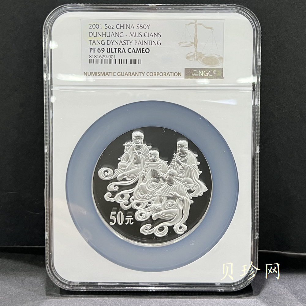 单币:2001年中国石窟艺术(敦煌)金银纪念币-唐代奏乐图5盎司高浮雕精制银币