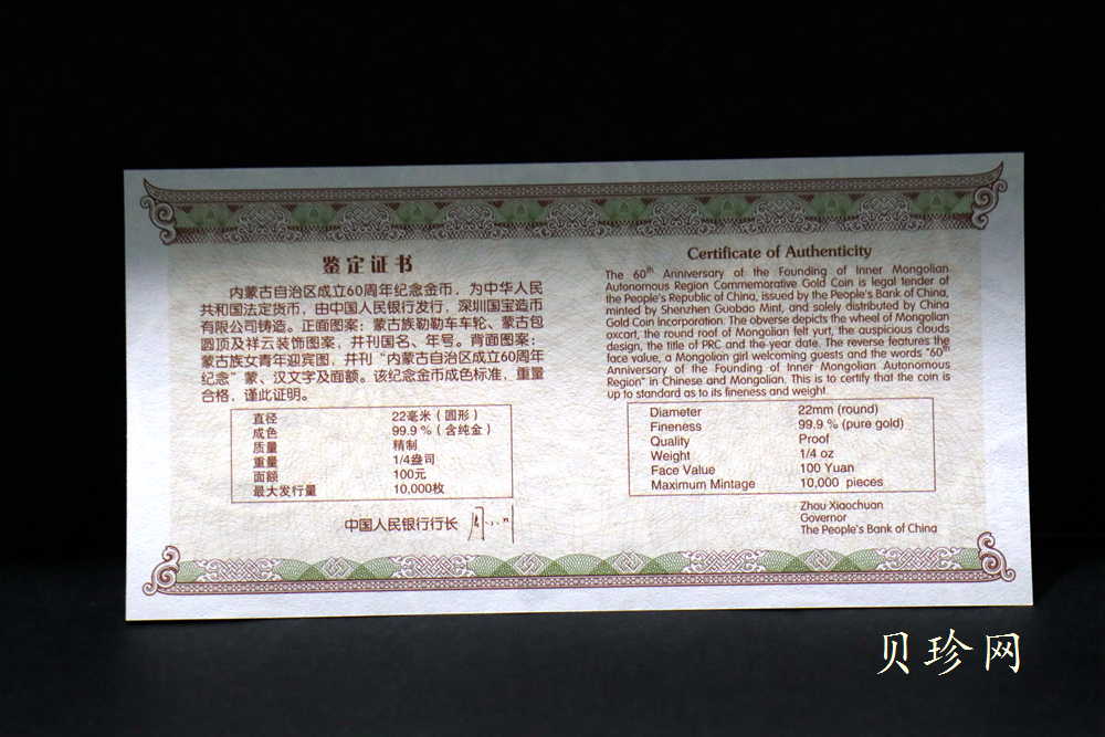 【070202】2007年内蒙古自治区成立60周年1/4盎司精制金币