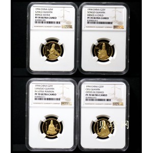 送子观音:慈眉善目,充满世俗人格化色彩是1994年“送子观音”金银币最突出的神韵。“千处祈求千处应”是观音信仰的核心,作为民间创造出来的“送子观音”,是民间伦理“多子多福”的印照,愿大慈大悲观音菩萨保佑,赐予信徒子孙满堂,香火旺盛,家族锦延。