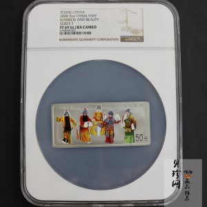 该银币以长方形宽幅形制展现了《龙凤呈祥》中的主要人物形象,使各个人物的形体动作都能伸展自如,尽管币面人物繁多,但没有拥挤局促之感。各人物形象生动鲜明,唱、念、做、打、极尽了中国京剧各角色的特色。