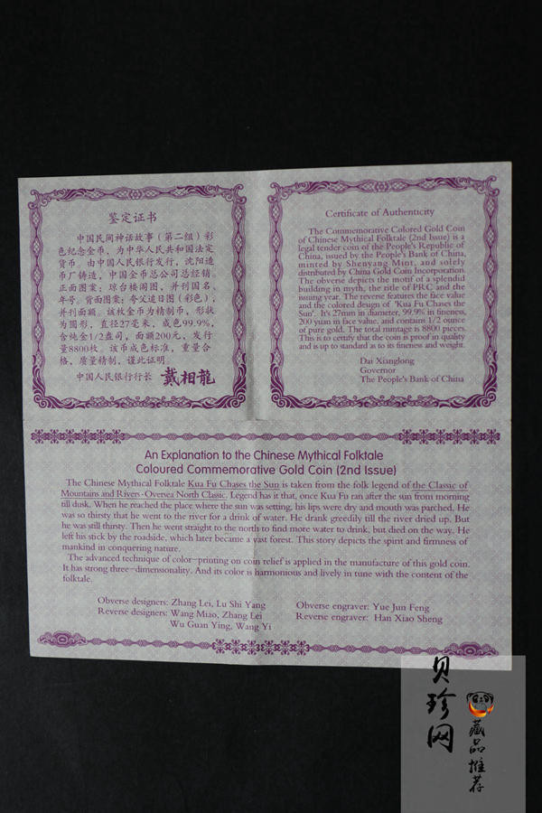 【020401】2002年中国民间神话故事彩色金银纪念币(第2组)-夸父追日1/2盎司彩色精制金币