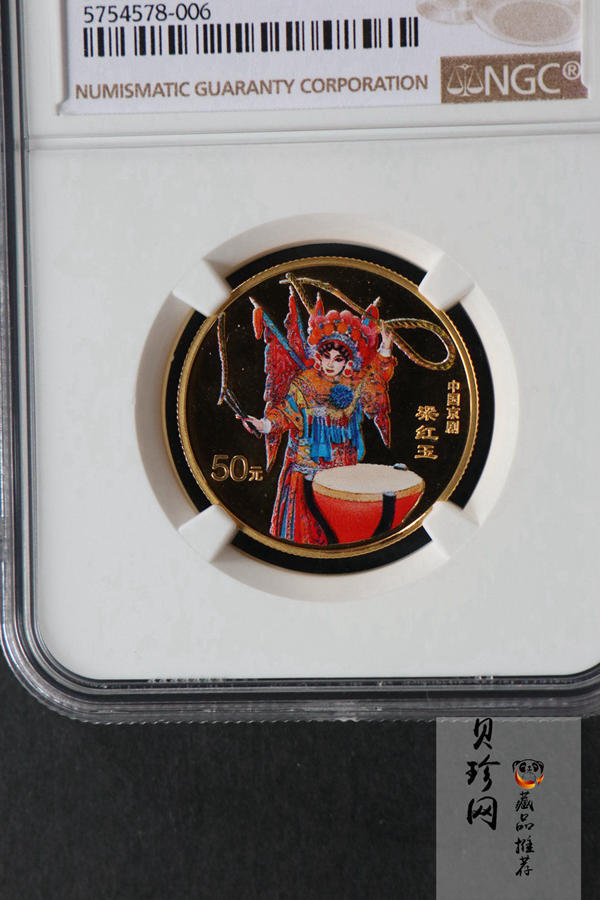 币面中梁红玉所着身靠,又花样繁多的靠旗、靠肚、靠甲、靠腿、靠绸、云肩、流苏、数十条彩色飘带、层层叠叠的袖口等等。这繁华富丽的设计最早出自梅兰芳先生之手,其舞台效果美不胜收。而该币极佳的品相与梁玉红故事的深入人心,以及中国京剧独特而隽永的综合表现艺术,使其拥有了经久不衰的魅力。