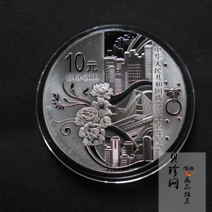 该币币面开启的大门设计。瞬间使币面画面充满了活力与情感,整个画面一下子便活了起来。大门的设计附有铜环、柳钉,是故宫那种有着岁月痕迹的古色古香的大门,暗喻古老的中国早已打开了大门,如今的中国已是科学、进步、富庶的中国。币面建筑设计巍峨壮观,雕刻一丝不苟、层次分明,充分展示了现代化、有序的城市风貌。那伸出门外鲜花不仅渲染了中华人民共和国成立60周年盛典的热闹气氛,同时也传达了人们面对祖国的繁荣昌盛内心所抑制不住的激动与情怀。