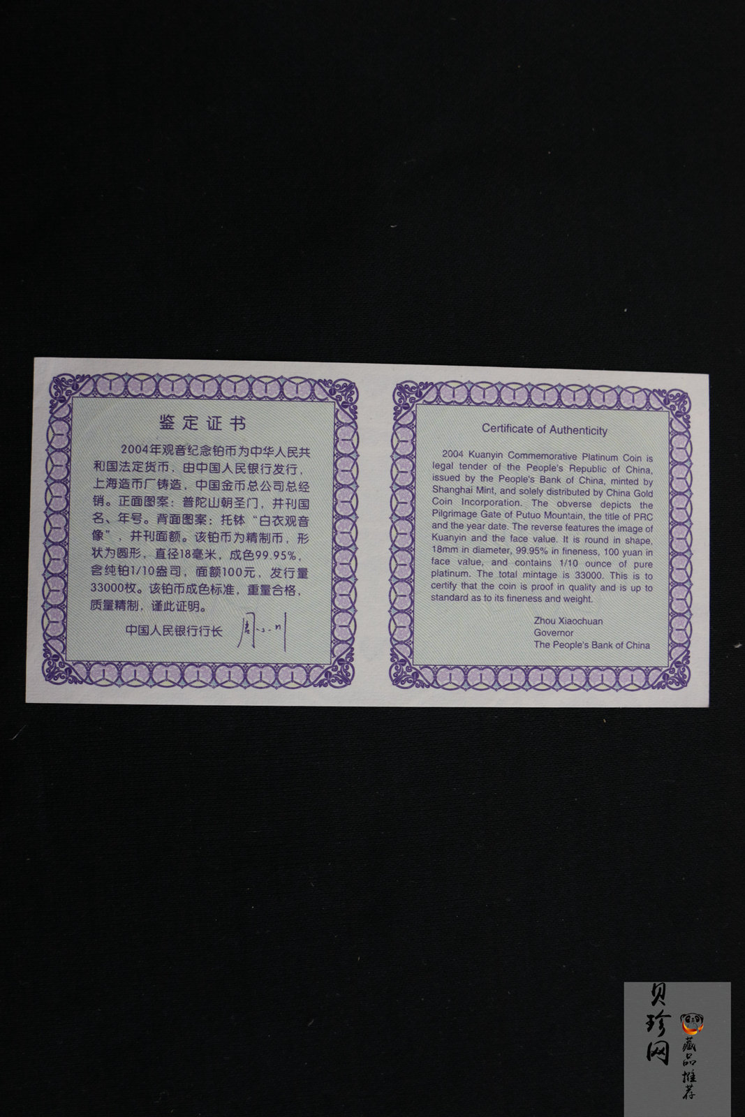 • 【040903】2004年观音铂纪念币-白衣观音像1/10盎司精制铂币